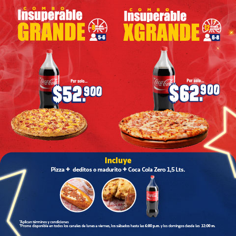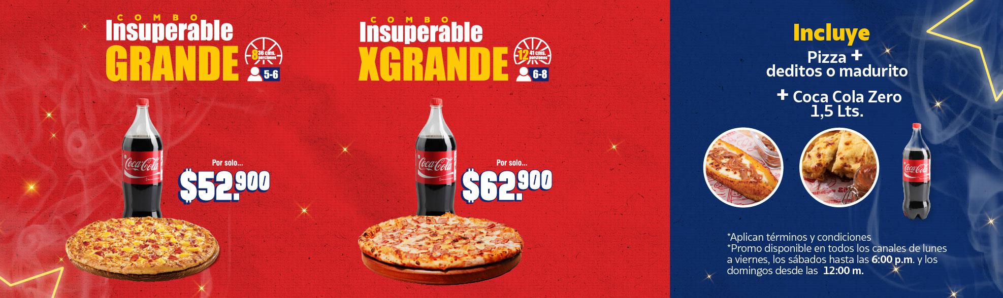 Pizza Extra grande 12 porciones + 1 acompañante y gaseosa 1.5L por solo 59.990