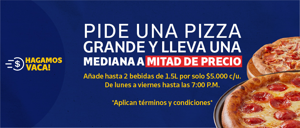 Pide una pizza grande de 8 porciones y lleva una mediana de 6 porciones a mitad de precio.