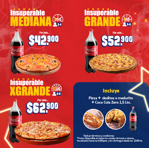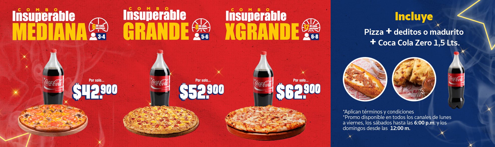 Pizza Extra grande 12 porciones + 1 acompañante y gaseosa 1.5L por solo 59.990